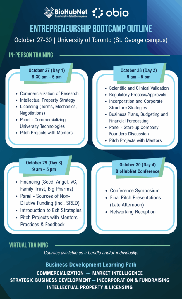 The OBIO Entrepreneurship Bootcamp, delivered in partnership with BioHubNet, helps trainee-entrepreneurs accelerate their life sciences ventures toward market readiness. Over 3 days of intensive in-person training (complemented by virtual courses), participants sharpen their strategies in commercialization, IP and licensing, regulatory pathways, and financing, while working closely with industry mentors. You’ll gain hands-on experience refining business plans and developing investment-ready pitches, culminating in the opportunity to compete in the Pitch Competition at the BioHubNet Annual Symposium on October 30th.